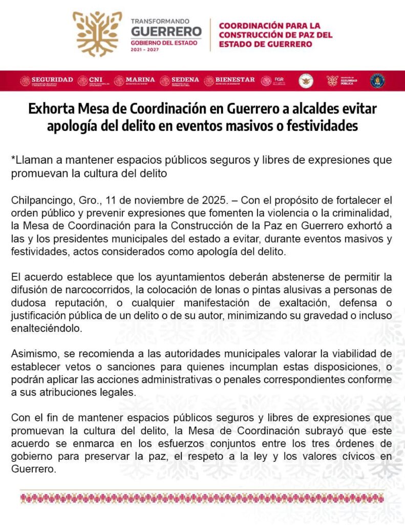 – «Exhorta Mesa de Coordinación en Guerrero a alcaldes evitar apología del delito en eventos masivos o festividades. *Logra coordinación posicionar entre los Estados con mayor avance en seguridad con reducción en delitos de alto impacto»
