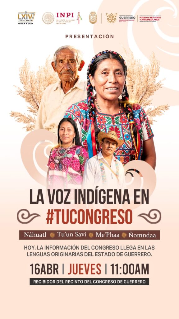 Chilpancingo, Gro., 19 de (Post Fecha 16) abril de 2026.— El Congreso del Estado realizó este jueves la presentación del proyecto “La Voz Indígena en tu Congreso”, así como la firma de un convenio de colaboración entre el Poder Legislativo, el Instituto Nacional de los Pueblos Indígenas en Guerrero y la Secretaría para el Desarrollo de los Pueblos Indígenas y Afromexicanos. El objetivo es garantizar el acceso a la información sobre las actividades legislativas mediante su traducción a las lenguas originarias náhuatl, tu’un savi, me’phaa y ñoomnda. Al dar la bienvenida, el presidente de la Junta de Coordinación Política, diputado Jesús Urióstegui García, señaló que este ejercicio representa un paso histórico para saldar una deuda con los pueblos originarios, al permitir que las leyes, reformas e iniciativas se traduzcan a lenguas maternas para que lleguen a las comunidades y fortalezcan su identidad, cultura e historia.